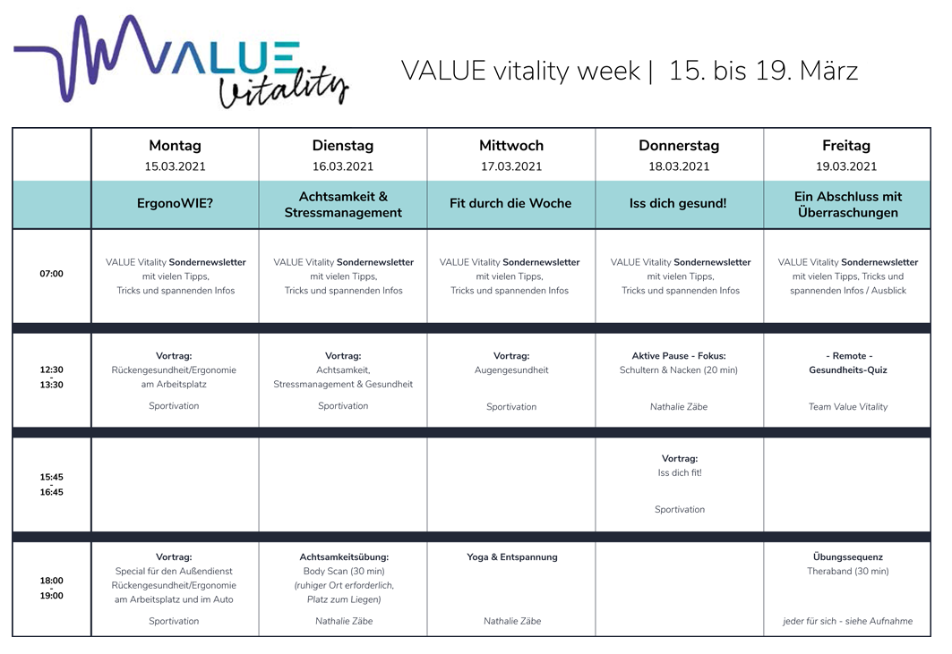 Seminare oder Workshops zu den Themen Stressmanagement und Achtsamkeit sensibilisieren weiter in diesem Bereich und stellen Hilfen dar, um gesundheitliche Risiken vorzubeugen. Durch Bewegungs- und Entspannungskurse werden Übungen zum eigenverantwortlichen Umgang mit stressigen Situationen im Alltag und am Arbeitsplatz geschaffen.