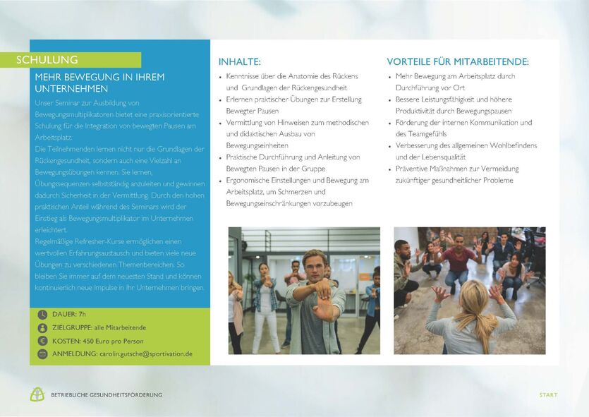 Lassen Sie sich oder Ihre Mitarbeiter zu Multiplikatoren für Ergonomie am Arbeitsplatz ausbilden. In unserer praxisorientierten Ausbildung von Bewegungsmultiplikatoren ein. Erfahren Sie, wie Sie bewegte Pausen effektiv in Ihren Arbeitsalltag integrieren und die Grundlagen der Rückengesundheit vermitteln können. Durch zahlreiche praktische Übungen und methodische Anleitungen gewinnen Sie die Sicherheit, Übungssequenzen selbstständig durchzuführen und Ihren Kollegen wertvolle Impulse für mehr Bewegung am Arbeitsplatz zu geben.